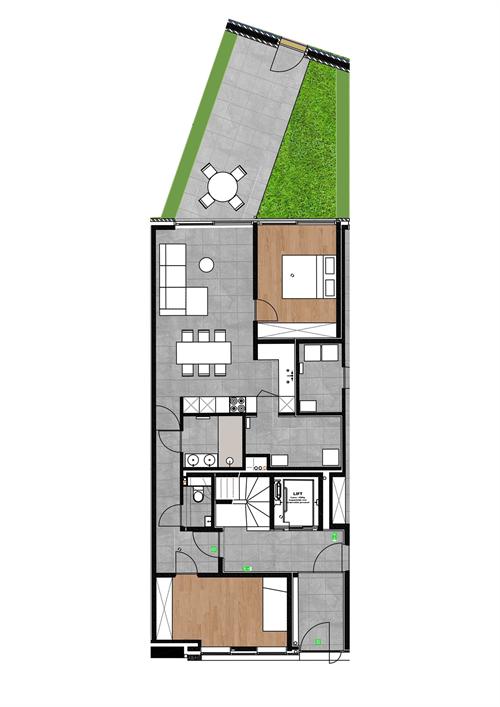 Dit appartement is voorzien van een ruime leefruimte, gebouwd volgens de meest recente, strenge comfort- en energie eisen. Er is ruim lichtinval, zowel aan de voorzijde of de achterzijde, zodat de ruimtes het nodige zonlicht binnenkrijgen. Zoals elk appartement is er gekozen voor energiezuinige technieken zoals een warmtepomp – individuele zonnepanelen – vloerverwarming, enz.